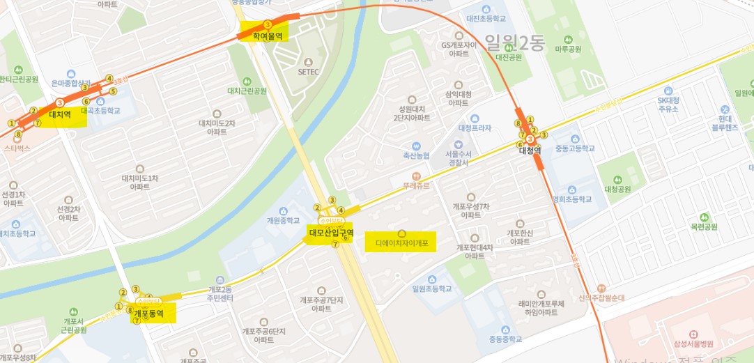 | 환경 | 강남 세브란스병원 삼성 서울병원 롯데백화점 현대백화점 |