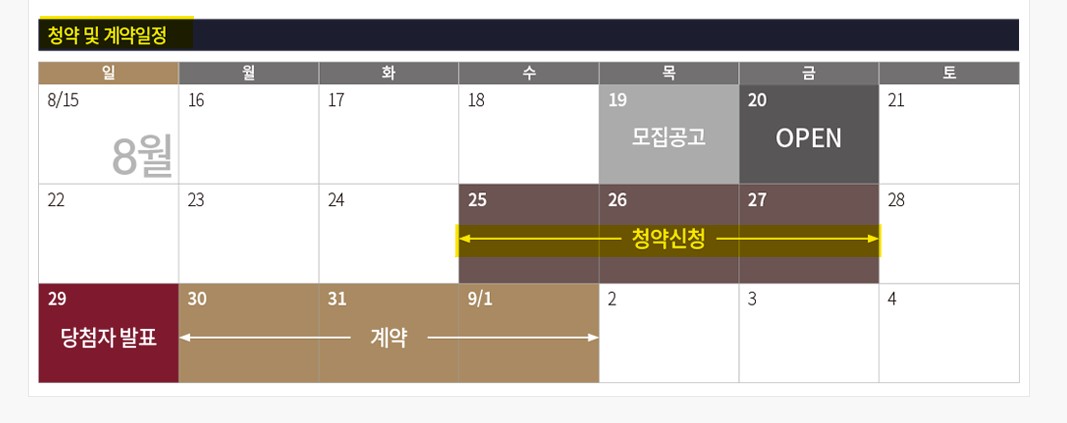 8월 25일-27일 청약신청 기간이며, 29일 당첨자 발표, 30일~9월 1일 정당계약을 진행한다. 계약금은 공급금액의 10%이며 계약일 천만 원, 1개월 이내 남은 금액을 납부해야 한다.