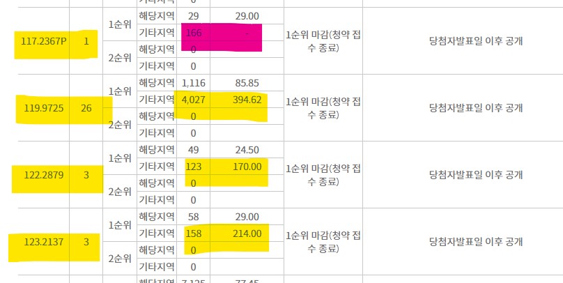 117 타입은 기타 지역에 배정된 세대가 없는데 166세대나 지원을 하였다. 그밖에 122,123세대는 낮은 세대를 배정하지만 소신 있게 지원한 분들은 나름 승리자이다. 상대적으로 높은 당첨확률이다.