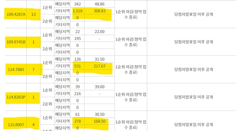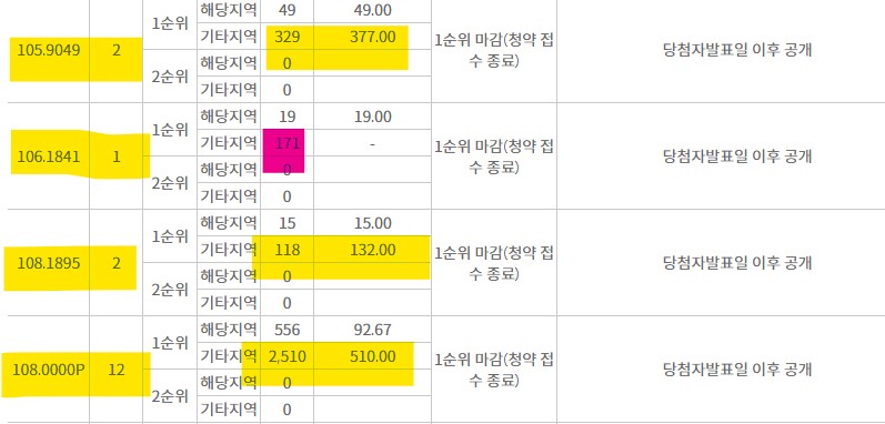재미있는 결과가 하나 있다. 아주 적은 세대가 배정된 108세대는 해당 지역은 15대 1, 기타 지역은 132대 1로 아주 낮은 경쟁률을 기록하며 상당히 괜찮은 당첨확률이 나왔다. 그 밖의 106 기타 지역 배정되지 않았음에도 171세대나 지원하는 안타까운 일이 또 일어났다.