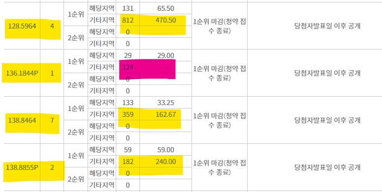 다른 타입대비하여 나름 괜찮은 당첨확률이다. 역시 0세대가 배정된 136 타입에 기타 지역에서 124명이나 청약을 한 점은 안타까운 일이다.