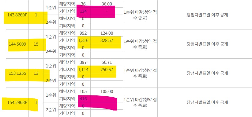 역시 배정이 전혀되지 않았는데, 기타 지역에서 청약을 한 부분은 아쉽다. 무난한 경쟁률을 기록한 140~150 타입이다.