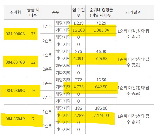 84타입84 타입 경쟁률이다. 84 타입은 100% 가점제이며, 엄청난 경쟁률을 기록하였다. 84P타입이 이번 청약의 최고 경쟁률 2,474대 1을 기록하였다.