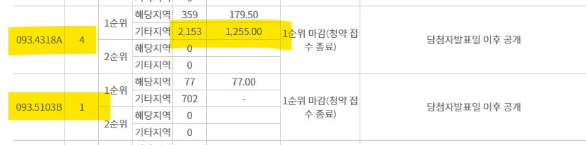 93타입의 경쟁률이다. 93B의 경우 기타 지역은 배정된 세대가 없는데 무려 702세대나 청약을 하였다. 청약 정 관련 정보를 꼼꼼히 살펴봐야 하는 이유이기도 하다. 안타까운 일이다.