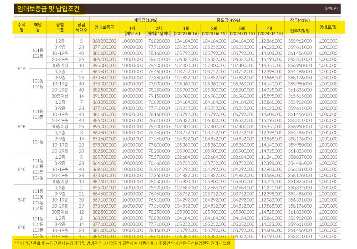현재 모집공고문은 임대보증금 9억, 임대료 100만 원 월세 형만 공고된 상태이다. 이에 많은 분들이 실망을 한 상태이지만, 수지구청형 롯데캐슬 하이브엘 측에서는 10년 후 우선 분양을 받을 수 있는 전세형이 별도로 마련된 상태이며, 확정분양가를 포함 한 정보를 당첨자에 한 하여 안내할 예정이라고 한다. 당첨 후 관련 내용 확인 후 계약 여부를 결정하면 될 듯하다.